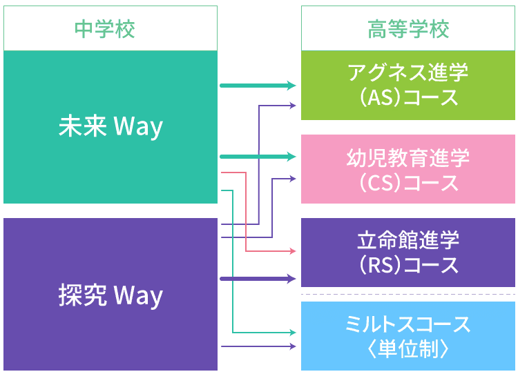 中高一貫教育校としての利点を最大限に活かしたコース編成が特長です。一人ひとりの希望の進路を確かなものにするため、中高6年間において「中学」「高校」ごとにコース編成を行います。
